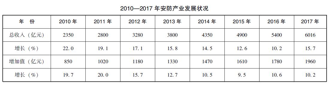 目前,可将安防行业总体形势概括为:行业政策红利持续释放,产业规模迈上新台阶,产业仍保持中高速以上增速,产业结构不断优化,产品出口贸易稳步发展,技术创新不断深化,行业应用进一步拓展,一批骨干企业蓄势发力。
